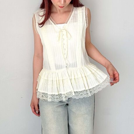 首元はVネックでデコルテ見えが叶うので嬉しい小顔効果も。