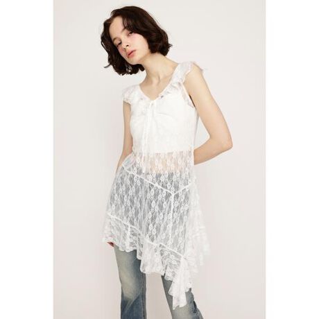 【HEM DESIGN LACE FRILL L/TOPS】■POINT:ヘムデザインがポイントのフリルレースロングトップス。■DETAIL:ストレッチの効いたフラワーレース素材を使用し、襟ぐりのフリルとリボンディテールが着用するだけで女性らしい印象に。斜めシームのカッティングのヘムデザインもポイントです。■STYLING:甘さのあるアイテムなので、ボトムにはデニムなどカジュアルダウンさせて合わせるスタイリングが今季おすすめです。■FABRIC/MATERIAL:ストレッチの効いたフラワーレース素材を使用しています。■透け感:あり■光沢感:なし■伸縮性:あり■裏 地:なし[注意事項]※画像の商品はサンプルです。実際の商品と仕様、加工が若干異なる場合があります。※画像の商品は光の照射や角度、お使いのモニター環境により、実物と色味が異なる場合がございます。※着用、お取り扱いの際は、アテンションタグをご確認ください。※一部予約商品につきましては生産上の都合によりお届け予定日や店頭発売と前後する場合もございます。※追加生産商品は、一部の店舗、通販で販売中の場合がございます。予めご了承下さい。