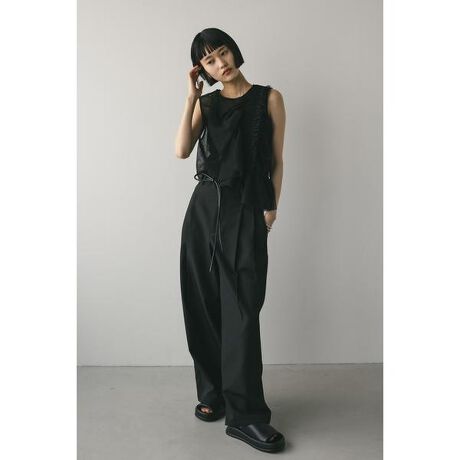 [型番:500IST30-3901]モデル身長166cm(FREEサイズ着用)たっぷりとしたギャザーとフリルで華やかに仕上げたチュールベスト。チュール素材ならではの程良い透け感と存在感抜群のボリューミーなデザインがポイント。アシンメトリーなデザインと詰まった首元のクルーネックがモードの印象に導きます。透け感あり、ストレッチあり。【お手入れ方法】手洗い可