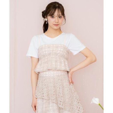 ドット×フラワーデザインが華やかな、インナーTシャツ付きビスチェ【Design】・繊細なドット柄と立体感のあるフラワーデザインが華やかな、インナーTシャツ付きドットフラワービスチェ。・ふんわり広がるペプラム風の裾が、ウエスト周りをすっきり見せつつ、フェミニンな印象をプラスします♪・背中部分はシャーリング仕様で伸縮性があり、大きなリボンを結ぶことで自分好みのフィット感に調整可能◎・肩紐にはアジャスターが付いており、スタイルに合わせて長さ調整も簡単です。・同素材を使ったドットフラワーチュールスカート【品番:20082512100142】と合わせて、トレンドのセットアップ風コーデを楽しめるのも魅力!【Fabric】・フラワーレースを施したドット柄の生地を使用。・表地は透け感のあるチュール素材です。・しなやかな裏地付き。・Tシャツはシンプルな無地なので、他のコーディネートでも着回していただけます。・ホワイト、ピンク、ラベンダー、ブラックの4色展開となります。【Care】ドライクリーニング