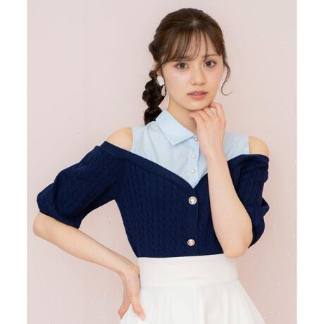 ひと目でおしゃれが決まる、優秀レイヤードニット【Design】・トレンドのマリンテイストとスクールライクな雰囲気をミックスした、旬顔のレイヤードニット。・ノースリーブシャツブラウスとオフショル風カーディガンがドッキングされたデザインで、1枚でこなれ感のある夏コーデが完成します◎・肩を美しく魅せるオープンショルダーデザインが、女性らしさを引き立てつつ涼しげな印象に。・ケーブル編み風の表情感のあるニット素材が、上品さとリラックス感を両立!・ニットカーディガン部分は縫い付け仕様なので、ずれ落ちる心配がなくストレスフリーな着心地です。・程よい五分袖で、肌見せのバランスも絶妙な大人フェミニンアイテムです♪【Fabric】・ニット部分は伸縮性があり、優しい肌触り。・シャツ部分は程よいハリ感のあるコットン混の生地を使用。・ご自宅でお手入れが出来るのも嬉しいポイント♪・ホワイト、ベージュ、イエロー(阪神梅田本店・博多阪急店・WEB限定カラー)、ピンク、ネイビーの5色展開となります。【Care】手洗い可能