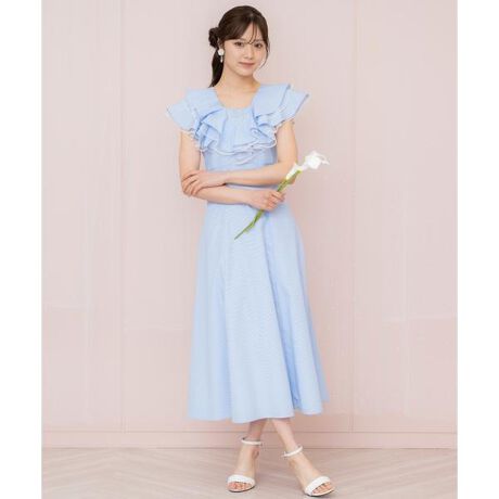 繊細なストライプ柄が上品に夏ムードを演出してくれる、ノースリーブワンピース【Design】・ラッフルフリルが肩周りを華やかに彩る、女性らしさ溢れる一着。・ヘアラインストライプ柄が夏らしい爽やかさと上品さを演出します。・肩先までしっかりカバーしてくれるボリュームフリルに、チュールを重ねて軽やかな印象に♪・ウエストバックはゴム&レースアップ仕様でサイズ調整ができるので、ぴったりフィットしながらも快適な着心地です。・左脇には着脱しやすいファスナー付きで、機能面も◎・裾にかけて広がるAラインのフレアシルエットが、動くたびにレディなムードを引き立てます。【Fabric】・カジュアル見えしない細めのストライプ柄の生地を使用。・程よいハリ感としなやかさを併せ持つポリエステル素材です。・表地付き。・レッド、サックス、ネイビーの3色展開となります。【Care】ドライクリーニング