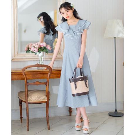 繊細なストライプ柄が上品に夏ムードを演出してくれる、ノースリーブワンピース【Design】・ラッフルフリルが肩周りを華やかに彩る、女性らしさ溢れる一着。・ヘアラインストライプ柄が夏らしい爽やかさと上品さを演出します。・肩先までしっかりカバーしてくれるボリュームフリルに、チュールを重ねて軽やかな印象に♪・ウエストバックはゴム&レースアップ仕様でサイズ調整ができるので、ぴったりフィットしながらも快適な着心地です。・左脇には着脱しやすいファスナー付きで、機能面も◎・裾にかけて広がるAラインのフレアシルエットが、動くたびにレディなムードを引き立てます。【Fabric】・カジュアル見えしない細めのストライプ柄の生地を使用。・程よいハリ感としなやかさを併せ持つポリエステル素材です。・表地付き。・レッド、サックス、ネイビーの3色展開となります。【Care】ドライクリーニング