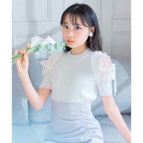 オーガンジー生地のフリルテープがアクセントになったプルオーバー【Design】・たっぷりフリルのオープンショルダーがフェミニンムードを高めてくれます。・フリル部分はオーガンジー生地を使用し、ほんのりとした透け感がコーディネートの透明度をアップ♪・ややハイネックめに仕上げた襟ぐりと、フリルテープ&共リボンが露出を抑え、程よい肌見せ感でご着用いただけます。・気温の高くなる季節におすすめな半袖デザイン!・伸縮性の良いリブニットなので着心地もよく、合わせるボトムを選ばない着回し抜群アイテムです。・ウエストインしやすい着丈なので、ハイウエストなボトムスと合わせても着ぶくれせずスッキリと着こなしが可能!【Fabic】・着心地のよい、伸縮性のあるニット生地を使用。・ご自宅でお手入れが出来るのも嬉しいポイント♪・エクリュ、ピンク、ブラックの3色展開となります。【Care】手洗い可能