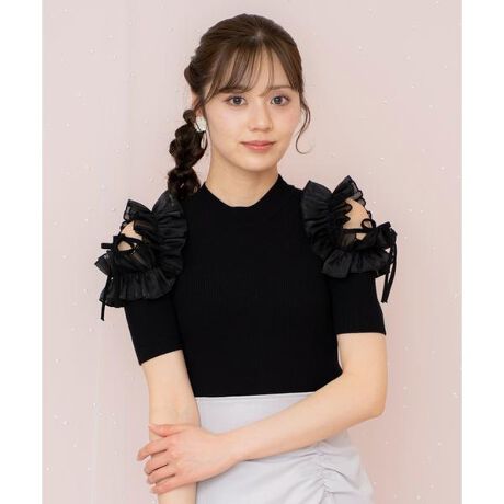 オーガンジー生地のフリルテープがアクセントになったプルオーバー【Design】・たっぷりフリルのオープンショルダーがフェミニンムードを高めてくれます。・フリル部分はオーガンジー生地を使用し、ほんのりとした透け感がコーディネートの透明度をアップ♪・ややハイネックめに仕上げた襟ぐりと、フリルテープ&共リボンが露出を抑え、程よい肌見せ感でご着用いただけます。・気温の高くなる季節におすすめな半袖デザイン!・伸縮性の良いリブニットなので着心地もよく、合わせるボトムを選ばない着回し抜群アイテムです。・ウエストインしやすい着丈なので、ハイウエストなボトムスと合わせても着ぶくれせずスッキリと着こなしが可能!【Fabic】・着心地のよい、伸縮性のあるニット生地を使用。・ご自宅でお手入れが出来るのも嬉しいポイント♪・エクリュ、ピンク、ブラックの3色展開となります。【Care】手洗い可能