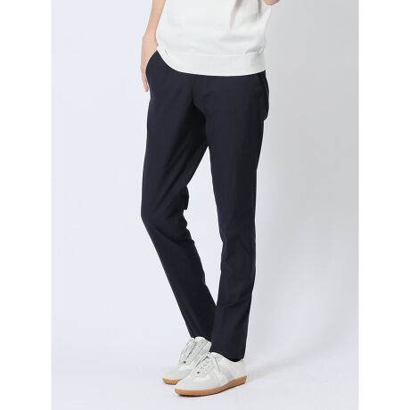 すっきりとしたノータックのテーパードパンツです。サイドに太ゴムを入れたウエストマジック仕様で着用ストレスを軽減。センタープレス加工、フロントファスナー、ベルト通し付き、前後ポケット付き、裾部分は未加工です。