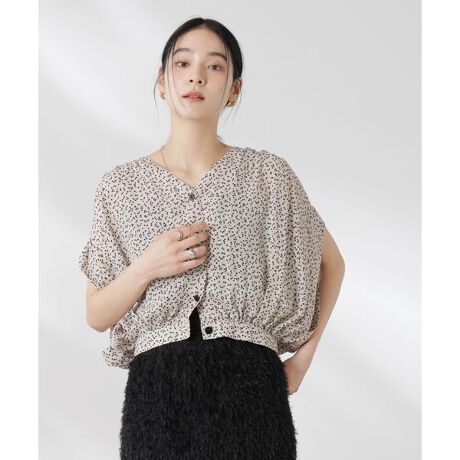 スクエアの細かな変形ランダムドット柄が目をひくVネックブラウス。ややワイドなゆったりめの身幅にショート丈でバランスを取ったトレンド感のあるシルエット。裾切り替えでギャザーがたぷっとたまるフォルムが可愛い一着です。