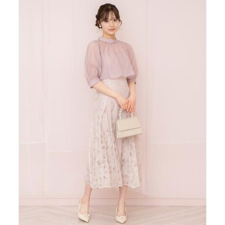シアーブラウス×フラワーレースワンピースがセットになったオケージョンドレス【Design】・きらめくスパンコールと立体的なフラワー刺繍が華やかな一着。・ブラウスは後ろがクロスデザインになっており、抜け感を演出してくれます。・ワンピースは透け感のあるレース生地を重ねた奥行きのあるデザイン。・裾をスカラップデザインに仕上げ、スカートのフレアをより上品に格上げ♪・ブラウスは、ワンピースの上から着るのはもちろん、インナーのように中に着るのもおすすめ◎・ワンピースの肩紐にはアジャスターがついているので、着丈を調整することが可能。・結婚式や二次会、謝恩会などのパーティーシーンに、お呼ばれドレスとして活躍してくれるアイテムです。・ブラウス:被り仕様/後ろ開き・ボタン留め仕様・ワンピース:肩紐アジャスター付き・左ファスナー仕様/後ろゴム&レースアップ仕様【Fabric】・ブラウスは控えめなパール感のあるシアー素材を使用。・花柄の刺繍レース生地のワンピースには、スパンコールをあしらいました。・ピンク、ラベンダー、ブラックの3色展開となります。【Care】ドライクリーニング