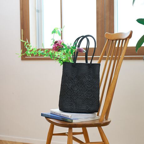 リサイクルされたビニール紐を編んで現代向けにアレンジされた工芸品で、軽量で耐久性があるため現地ではお買い物バッグとして日常使いされています。