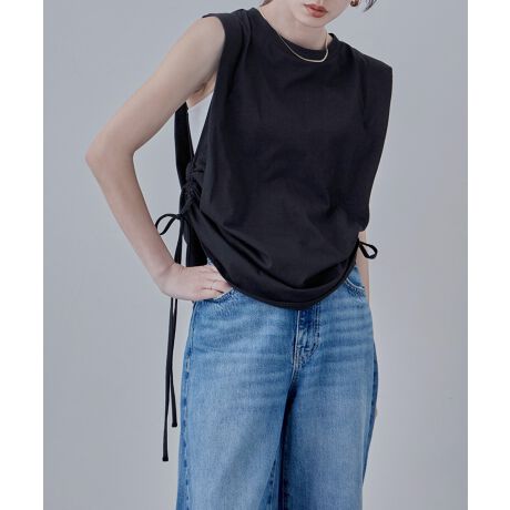 肩にタックを入れることで立体的になり二の腕が華奢にみえる様なデザイン、スリーブレスでヘルシーな肌見せもしつつ、サイドの紐をしぼってシャーリングのアレンジも楽しめます。
