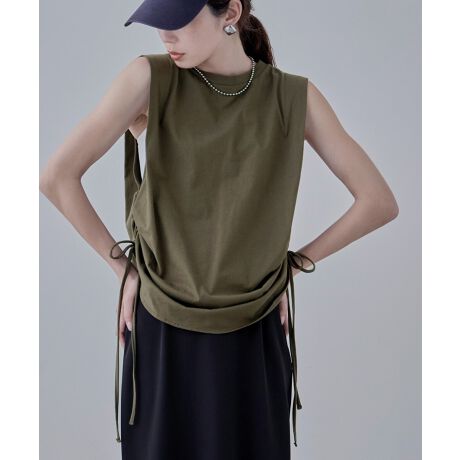 肩にタックを入れることで立体的になり二の腕が華奢にみえる様なデザイン、スリーブレスでヘルシーな肌見せもしつつ、サイドの紐をしぼってシャーリングのアレンジも楽しめます。