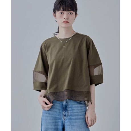 ゆったりとしたサイジングで気になるところをカバーしつつ、オーガンジー素材を使った袖と裾の切り替えデザインで、軽やかな印象も+。