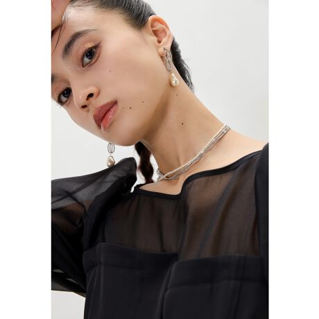 シンプルなスタイリングでも、胸元を華やかに引き立ててくれます。