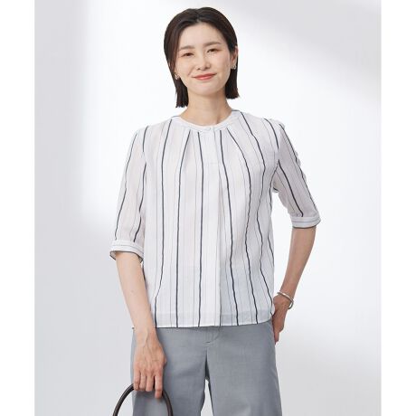 ■デザインシンプルながらも洗練されたデザインが魅力のクルーネックブラウス。襟元に施したタックと釦のディティールがさりげないアクセントになり、きれい目な印象を与えます。二の腕を自然にカバーする5袖丈と、パンツにもスカートにもバランスよく馴染む短めの丈感がポイント。程よい透け感が軽やかさをプラスし、涼しげで女性らしい着こなしを叶えます。さまざまなスタイルに溶け込み、日常に上品さを添える1枚です。