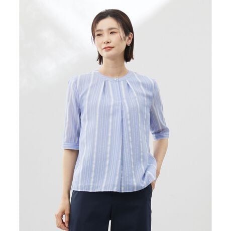 ■デザインシンプルながらも洗練されたデザインが魅力のクルーネックブラウス。襟元に施したタックと釦のディティールがさりげないアクセントになり、きれい目な印象を与えます。二の腕を自然にカバーする5袖丈と、パンツにもスカートにもバランスよく馴染む短めの丈感がポイント。程よい透け感が軽やかさをプラスし、涼しげで女性らしい着こなしを叶えます。さまざまなスタイルに溶け込み、日常に上品さを添える1枚です。