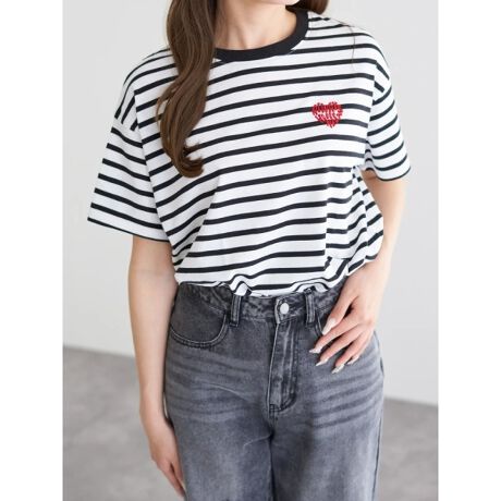 ハート型のロゴ刺しゅうがキュートなアクセントをプラスするTシャツ。