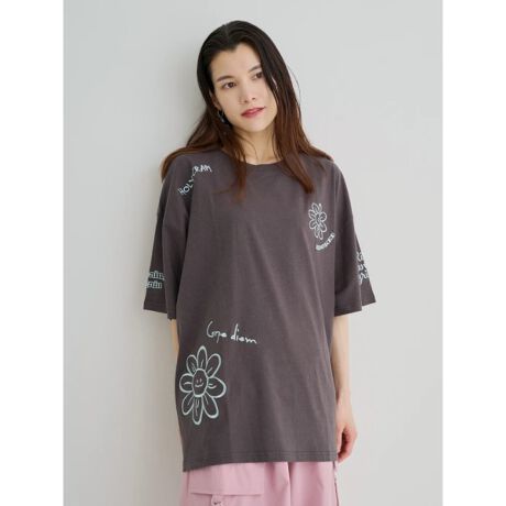 手書き風のフラワーロゴ刺しゅうが散りばめられたTシャツ。