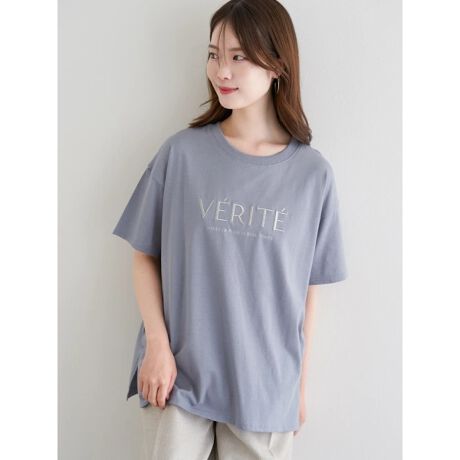 ラメ刺しゅうのロゴデザインが目を惹くTシャツ。