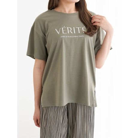 ラメ刺しゅうのロゴデザインが目を惹くTシャツ。