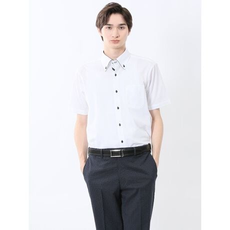 夏場のクールビズに大活躍してくれる、前開き仕様のビズシャツです。清潔感のある白の織り柄です。衿型はアンタイド(ノーネクタイ)でも衿立ちよく収まり、オフィスカジュアルにもぴったりなボタンダウンを採用しています。下前立のテープ使い、衿足内側の別生地切替、衿先のパイピングがアクセントになっています。