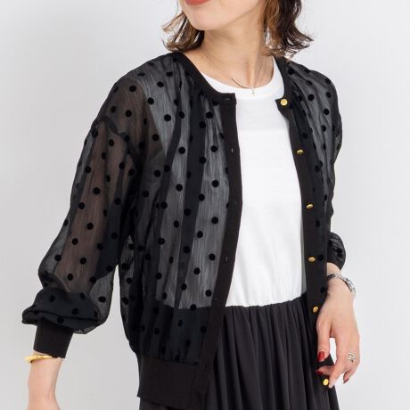 ・シアー感のあるドットプリントの布帛生地に、ニットのリブの付属を付けた、ブラウスライクなカーディガン