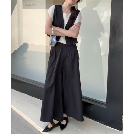 ショート丈のベストとハイウエストのワイドパンツでキレイ見せしながらスタイルアップも叶う!
