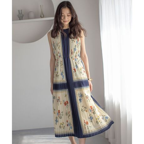 ■デザイン・花柄とハートチェーンスカーフ柄を前後計8枚組み合わせたインクジェットプリント。・細かいヒダの総プリーツ加工により柄が主張しすぎないデザインに。・全体を引き締めるパネル柄ならではの額縁が大人のスタイリングに馴染みます。・花柄のプリントの中に遊び心でKUMIKYOKUロゴを入れています。