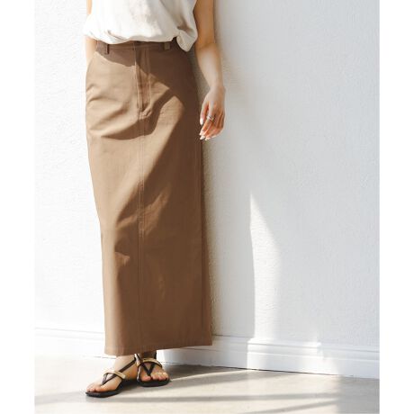 ワードローブに追加するだけで着こなしの幅がグッと広がる使い勝手のいいチノ素材のタイトスカート。