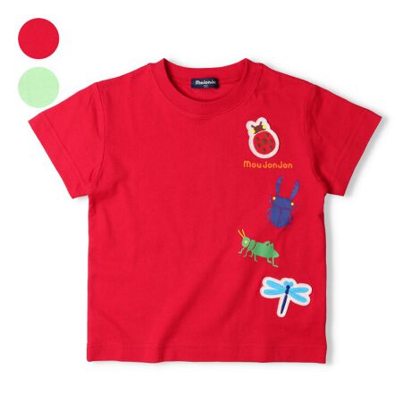 夏に人気の昆虫アイテム。テントウムシとトンボのワッペン付。レッドはクワガタとバッタのプリント、エメラルドグリーンはかぶと虫とカマキリのプリント入り。バックプリントも可愛い半袖Tシャツ。【アイテム】トップス カジュアル お洒落 オシャレ かっこいい かわいい 可愛い 普段着 デイリーウェア お出かけ着 お外着 お外遊び着 子ども服 こども服 男児 男の子 ボーイズ キッズ ベビーサイズ トドラーサイズ 幼稚園 保育園 小学校 通園 通学 小学生 2025年春夏物新作 丸高衣料 かぶとむし カブトムシ カブト虫 甲虫 赤色 薄緑色 ムージョンジョン コットン100% 綿100%