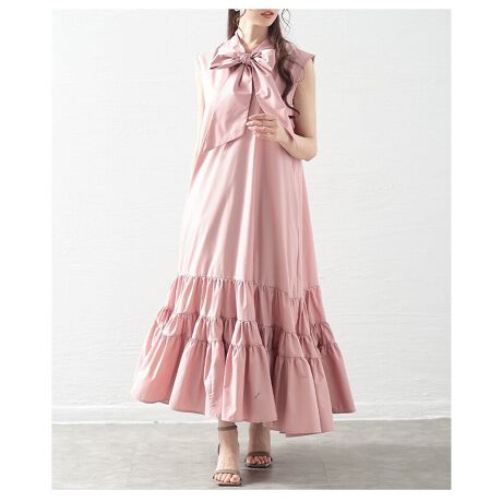 【ワンピース】 ティアード ボウタイ リボン フレア ノースリーブ ロング ブラック ピンク ブルー