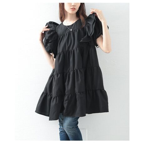 【チュニック】 フリル ティアード ボリューム袖 パフスリーブ フレア バックファスナー ブラック