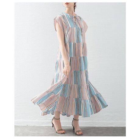 【ワンピース】 ティアード リボン 2way フレンチスリーブ フレア ロング 無地 ストライプ