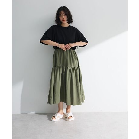 さらりとしたコットン混のTシャツに、ナイロン素材のティアードスカートをドッキングしたワンピース。カジュアルな雰囲気ながら、程よいボリュームのスカートが女性らしいシルエットを演出します。シックなバイカラー配色で、1枚でもサマ見えするデザイン。ウエストのドロストコードを絞ってお好みのスタイルでお楽しみいただけます。