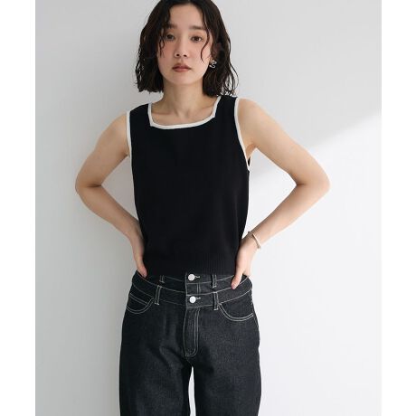 バイカラーデザインが目を惹くニットタンクトップ。肌触りのさらりとした素材で仕立て、伸縮性に優れ快適に着用していただけます。スクエアネックが顔まわりをすっきりと演出。メイントップとしてはもちろん、シャツやカーディガンのインナーとしても活躍する汎用性の高いアイテムです。透け感[ややあり]