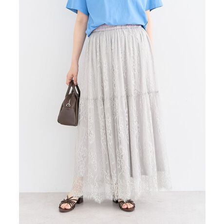 フラワーモチーフの繊細なレースが女性らしい着こなしを叶えるロングスカート。ふんわりと広がる華やかなティアードデザインで、シンプルなアイテムと合わせるだけでコーディネートが完成します。ウエストは総ゴムで、快適な着心地も嬉しいポイント。合わせるアイテム次第で、カジュアルにもきれいめにも着合わせできる万能レディアイテムです。透け感[なし]