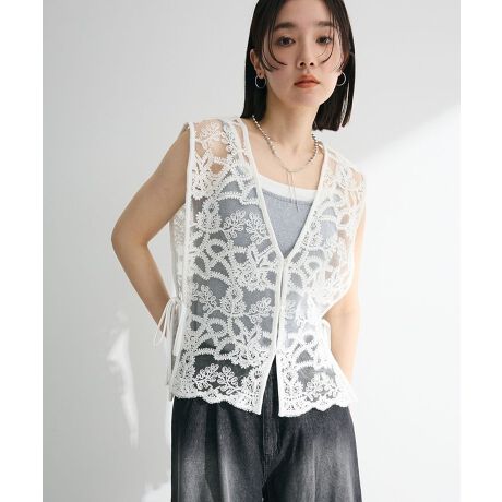 繊細なレース生地で仕立てたデザインベスト。前後どちらを前にしても着用できる2WAY仕様で着こなしの幅も広がります。サイドリボンでフィット感を調節でき、インナーがもたつきにくいのも魅力的。いつもの着こなしにオンするだけで奥行きのあるスタイリングが完成するおすすめのアイテムです。透け感[あり]