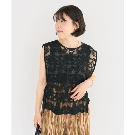 繊細なレース生地で仕立てたデザインベスト。前後どちらを前にしても着用できる2WAY仕様で着こなしの幅も広がります。サイドリボンでフィット感を調節でき、インナーがもたつきにくいのも魅力的。いつもの着こなしにオンするだけで奥行きのあるスタイリングが完成するおすすめのアイテムです。透け感[あり]
