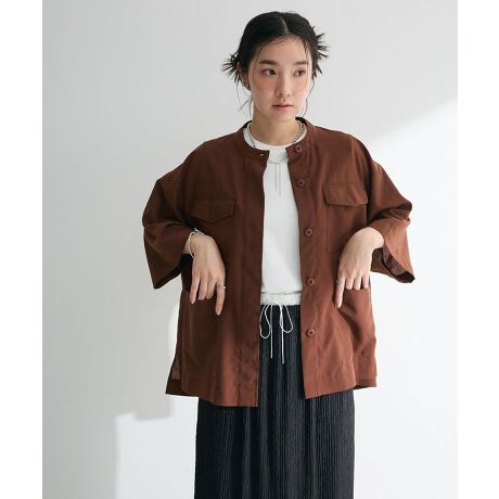 ポケットデザインがミリタリー感漂うシャツジャケット。1枚さらっと羽織るだけで程よくカジュアルな雰囲気をプラスしてくれます。爽やかなシャツ素材にバンドカラーが暑い季節もすっきりと快適な着心地をサポート。合わせるアイテム次第でカジュアルから甘めスタイルまで楽しめる、今季おすすめのアイテムです。透け感[なし]