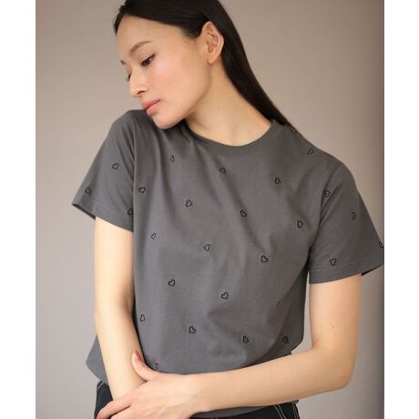 小粒のハート柄刺繍が散りばめられたデザインTシャツ。短丈のコンパクトフォルムで着やすく、トレンドのワイドボトムともバランスよく合わせていただけます。コットン混のさっぱりとした着心地も魅力的。ベーシックフォルムで使い勝手が良く、デイリーに活躍するおすすめのアイテムです。透け感[ややあり]