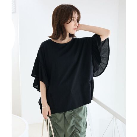 1枚で夏のスタイリングに映える異素材カットプルオーバー。袖から裾にかけて涼やかな素材をドッキングしたフレアデザインがフェミニンな印象を演出します。顔まわりをすっきりと魅せる、程よく開いたラウンドネックもポイント。シンプルなボトムに合わせるだけで華やかなスタイリングが完成するおすすめのアイテムです。