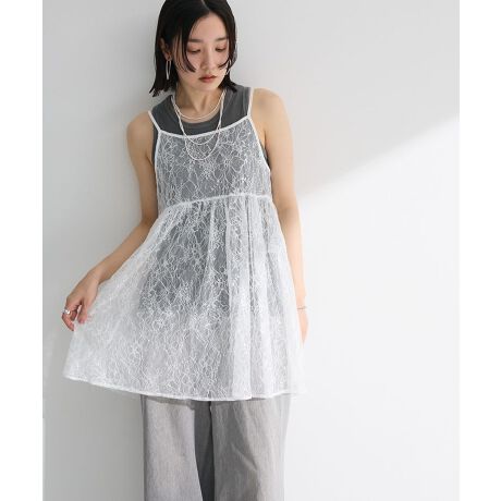 今季注目のレース素材で仕立てたデザインビスチェ。動くたびにきらりと光るスパンコールがおしゃれなアクセントをプラスします。前後で2通りの着こなしを楽しめる2WAY仕様なのも嬉しいポイント。カットソーに1枚合わせるだけでコーディネートを今年らしくブラッシュアップしてくれるおすすめのアイテムです。透け感[あり]