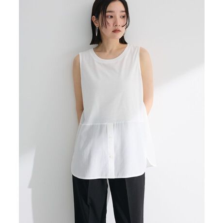 タンクトップにシャツをドッキングした夏のシーズンムード漂うデザインカットソー。リラクシーに着用できるゆったりシルエットに、女性らしい丸みのあるヘムラインが魅力の1着です。ベーシックで合わせやすいオフホワイトと爽やかなストライプの2色展開。1枚でさらっと着こなすのはもちろん、裾部分を覗かせてレイヤードも楽しめる汎用性の高いアイテムです。透け感[ややあり]