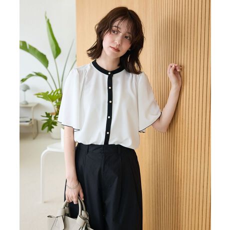 ネックラインや前立てのバイカラー配色がクラシカルな着こなしを叶えるブラウス。ふんわりと広がるフレアスリーブや、パール調ボタンがフェミニンな印象を与えます。ショルダー部分やバックヨークに施したギャザーのポイント使いがアクセントに。きれいめはもちろん、カジュアルアイテムと合わせたミックススタイルもおすすめです。透け感[ややあり]