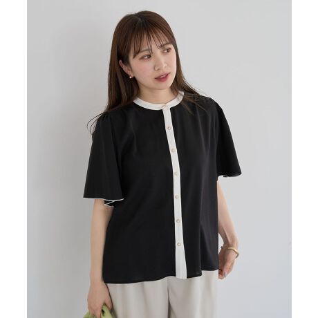 ネックラインや前立てのバイカラー配色がクラシカルな着こなしを叶えるブラウス。ふんわりと広がるフレアスリーブや、パール調ボタンがフェミニンな印象を与えます。ショルダー部分やバックヨークに施したギャザーのポイント使いがアクセントに。きれいめはもちろん、カジュアルアイテムと合わせたミックススタイルもおすすめです。透け感[ややあり]