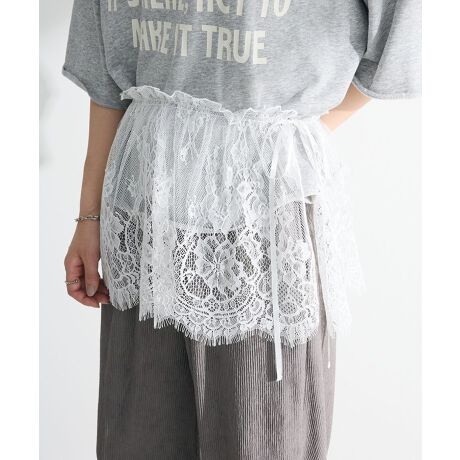 スタイルアレンジの幅が広がるレース素材の付け裾。繊細なフラワー柄にフリンジ風のスカラップヘムラインが洒落感溢れるデザインです。ウエスト総ゴム仕様で着用しやすく、サテンリボンでお好みのフィット感に調整出来るのも魅力的。コーディネートにフェミニンなアクセントを加えてくれるおすすめの差しアイテムです。透け感[あり]