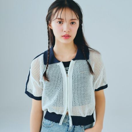 目の粗いメッシュ生地でさわやかに仕上げたカーディガンです。