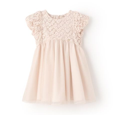 チュールレースに繊細な花柄を刺しゅうしたワンピースです。