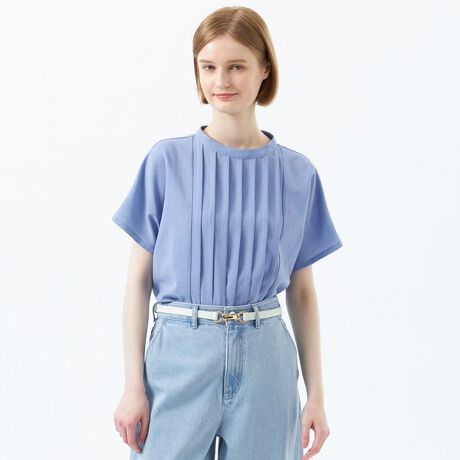 スラックスやスカートなどのキレイ目ボトムスに合わせたお仕事スタイルから、デニムパンツと合わせたカジュアルスタイルまで、着回し力は抜群です。フレンチスリーブなのでジャケットのインナーとしても、もたつかずスッキリと着用できます。
