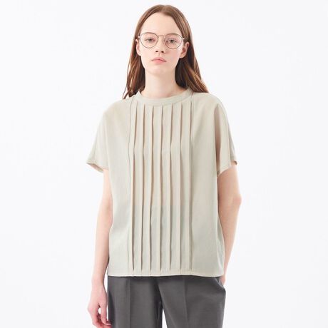 フラットな素材感ながら、タックディティールとナチュラルなメランジ調のカラーリングで、雰囲気のある一枚に。