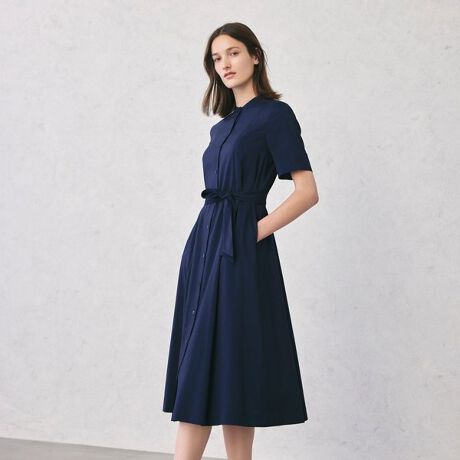 バンドカラーで襟元をすっきりとさせたワンピースです。